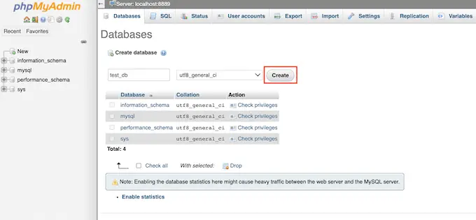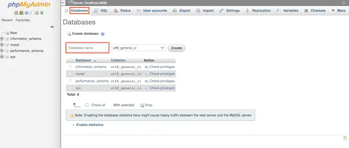 'phpMyAdmin' 아이콘을 클릭하면 새 탭에서 phpMyAdmin 애플리케이션이 열립니다. phpMyAdmin 대시보드에서 데이터베이스 탭을 클릭합니다.