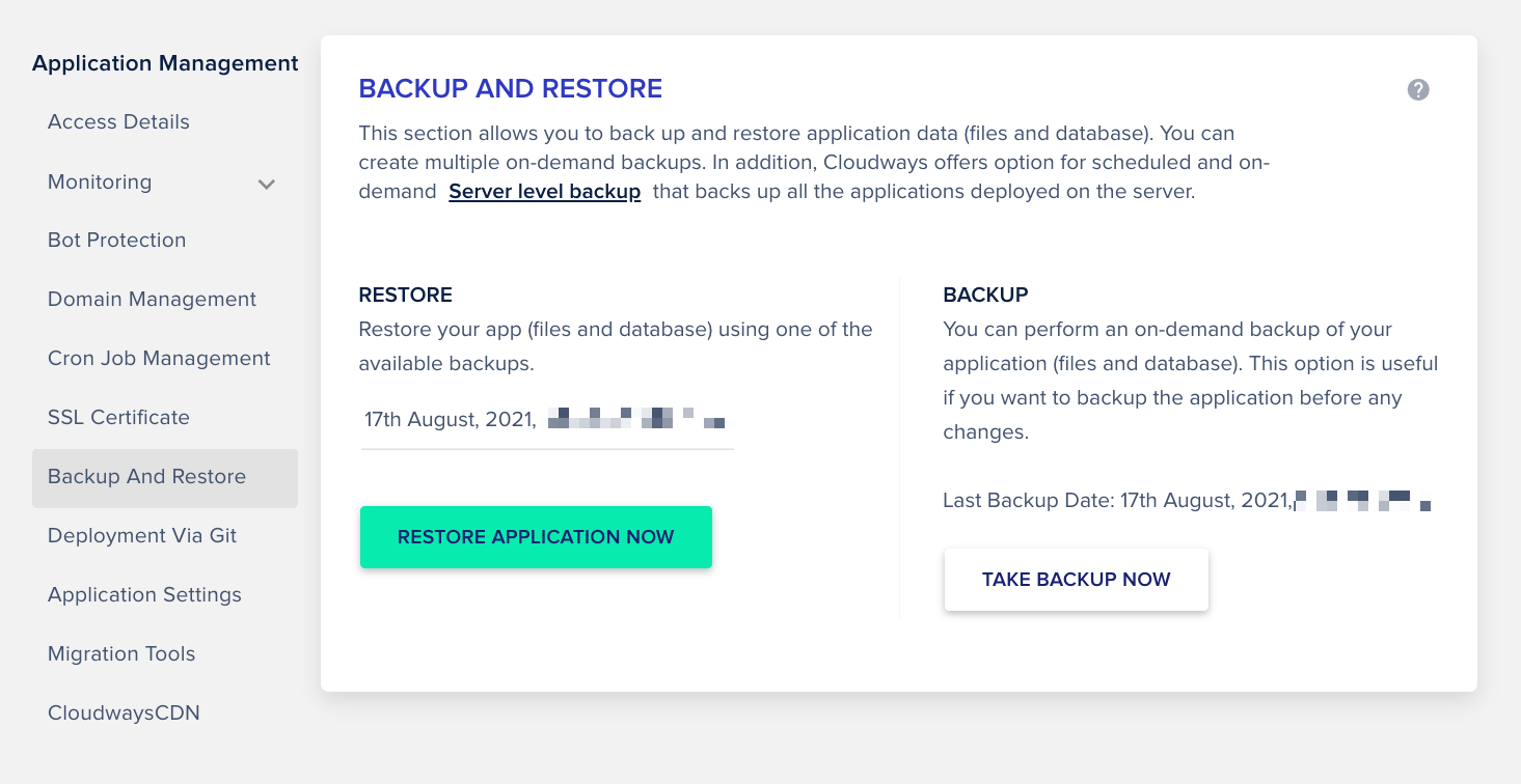 또한 Cloudways를 사용하면 새 기본 도메인 이름을 사이트에 쉽게 연결하고, 크론 작업을 설정하고, 새 SSL 인증서를 구성할 수 있습니다. 또한 사용 가능한 백업 중 하나에서 사이트를 복원할 수 있습니다.