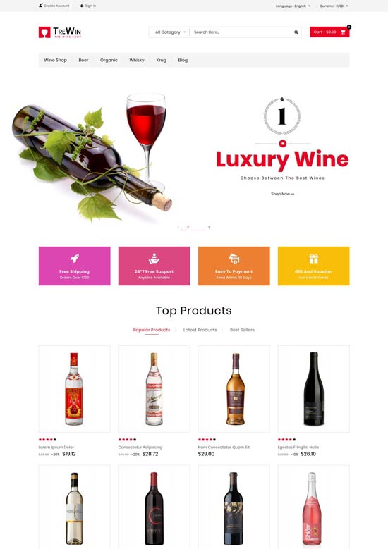 Trewin Wine Prestashop 테마는 완전히 반응하는 테마이며 모든 페이지가 완전히 사용자 정의되며 몇 번의 클릭과 설정으로 자신의 온라인 상점을 만들 수 있습니다. 이 테마는 설치가 쉽고 문제가 있는 경우 언제든지 문의할 수 있습니다. 홈 페이지는 관리 패널에서 사용자 정의됩니다.