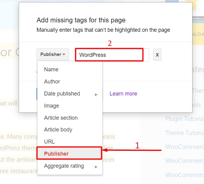 태그 목록에 없는 태그를 사용하려는 경우에도 태그를 추가할 수 있습니다. '누락된 태그 추가'를 클릭하여 WordPress 스키마 마크업에 대한 새 태그를 생성합니다.