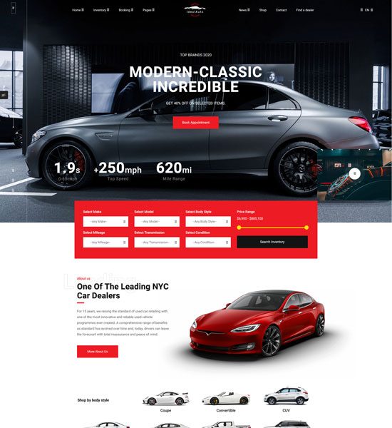 Motyw WordPress na nowoczesny samochód ze zintegrowanym systemem rezerwacji samochodów. Możliwy jest dobór samochodu według określonych parametrów, a także zamontowanie kolejki górskiej WooCommerce. Motyw został stworzony przy użyciu nowoczesnych i popularnych wtyczek takich jak: Visual Composer oraz Slider Revolution. Motyw jest idealny dla witryny dealera samochodowego, sklepu z częściami lub innej witryny o podobnej tematyce, w której musisz wyszukiwać według parametrów.