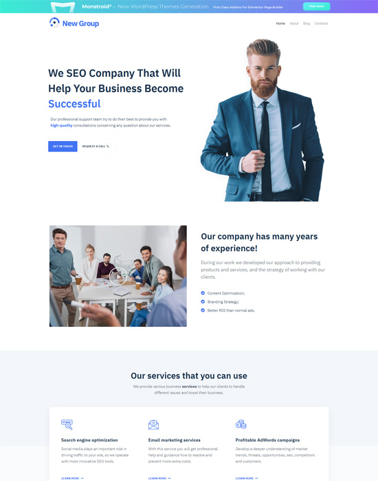 Ten darmowy motyw WordPress dla firmy konsultingowej o nowoczesnym wyglądzie i bogatej funkcjonalności. New Group to czysty i nowoczesny motyw WordPress, który dobrze nadaje się do witryn biznesowych, finansowych, politycznych, społecznych i ludzi.