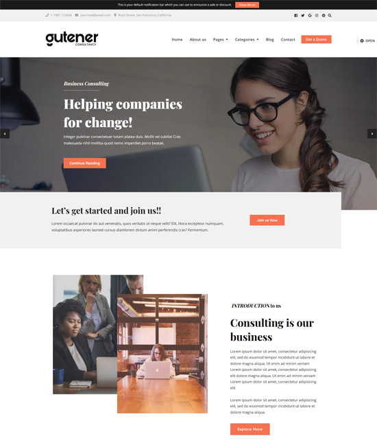 Gutener Business to czysty, kreatywny, potężny, elastyczny, wysoce konfigurowalny i gotowy do Gutenberga motyw WordPress. Jest w pełni responsywny i na pewno wyróżni Twoją stronę z tłumu. Gutener Business to uniwersalny motyw odpowiedni dla każdego typu witryny WordPress, takiej jak finanse biznesowe, księgowość, doradztwo, a najlepiej idealny dla każdego rodzaju witryny. Gutener Business jest wysoce konfigurowalny dzięki potężnym opcjom motywów, w tym wielu układom nagłówków i stopek. Kompatybilność z klasycznym edytorem WordPress, WooCommerce i Gutenburg ułatwia użytkownikom.