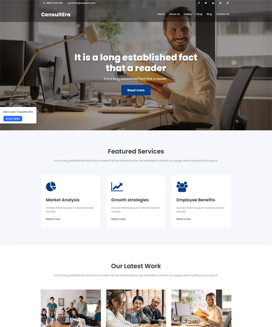 Consultant Lite to wysoce konfigurowalny, przejrzysty i w pełni responsywny, nowoczesny, uniwersalny motyw WordPress. Ten motyw jest przeznaczony głównie dla dostawców usług konsultingowych, a także freelancerów, start-upów i wszelkich innych organizacji. Twórz za pomocą nowoczesnych narzędzi i wielu opcji, korzystając z interfejsu API Personalizacja, który umożliwia łatwe dostosowywanie witryny za pomocą podglądu na żywo. Consultant Lite jest dostarczany z pełnoekranowym suwakiem, sekcją portfolio, sekcją usług, sekcją ostatnich postów i sekcją kontaktową wraz z CTA. Ten motyw obsługuje wyszukiwania Google zoptymalizowane pod kątem wyszukiwarek (SEO), jest kompatybilny z różnymi przeglądarkami i jest kompatybilny ze wszystkimi głównymi wtyczkami.