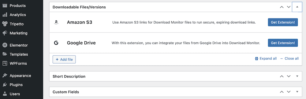 Tutaj przycisk „Dodaj plik” pozwala zrobić to, czego oczekujesz. Metabox rozszerzy się, oferując szereg pól na adres URL (wraz z przyciskami dostępu do Biblioteki multimediów), numer wersji i liczbę pobrań. Dwa ostatnie są opcjonalne: