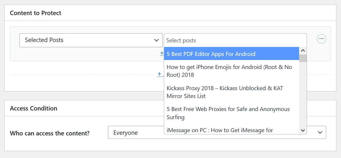 Możesz zacząć od wybrania warunku ograniczenia powyżej. Możesz wybrać posty, strony, kategorie, tagi, a nawet formaty, które chcesz ograniczyć.