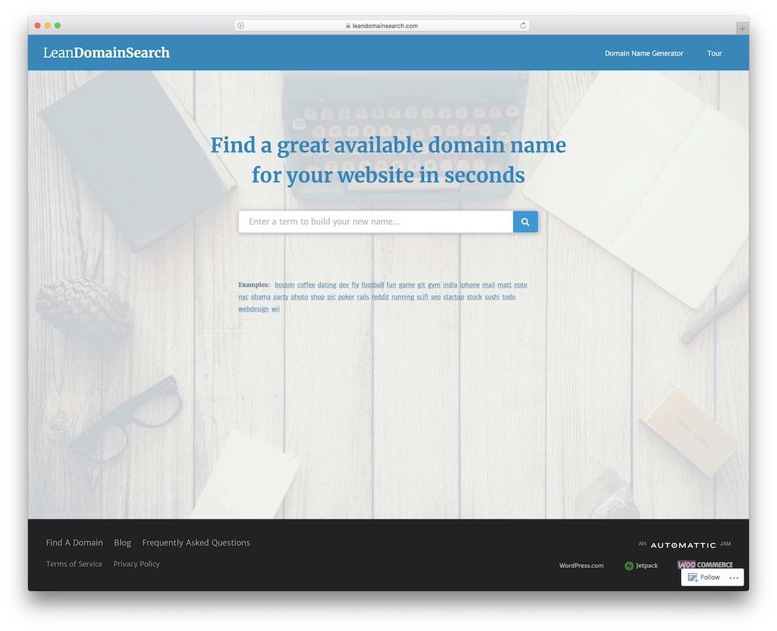 Lean Domain Search é um mecanismo de pesquisa que ajuda você a encontrar o nome de domínio desejado em segundos. Você deve inserir a palavra que deseja incluir no nome do seu blog e o mecanismo de pesquisa a emparelhará com outras palavras possíveis para obter uma combinação disponível para registro.