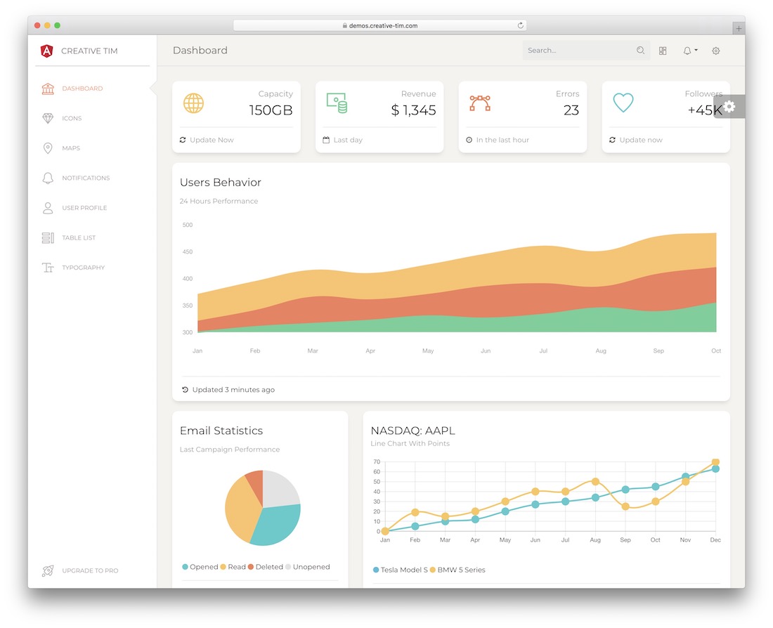 O pacote inclui todos os tipos de páginas prontas, capas coloridas, uma barra lateral com a opção de adicionar um plano de fundo de imagem, Google Maps, bem, você entende a essência. Para uma alternativa gratuita, o Material Dashboard Angular vem com muitas coisas práticas que ajudam você a começar com o pé direito desde o início.