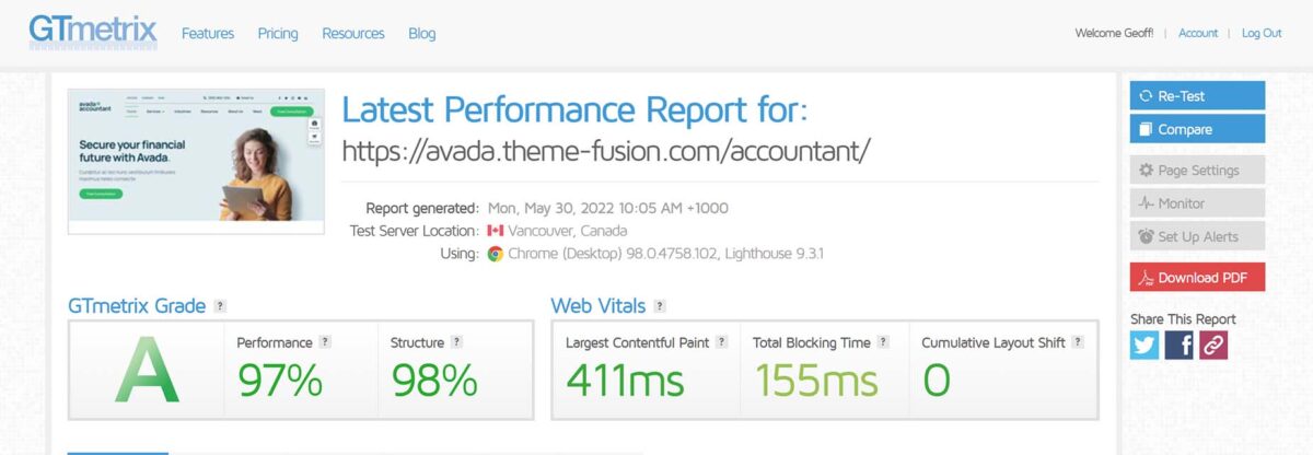 Avada é um tema WordPress leve e de alto desempenho. Obteve nota 'A' no GTmetrix com 97% em desempenho e 98% em estrutura. Claramente, o tema Avada é um dos temas WordPress mais rápidos e leves do mercado.