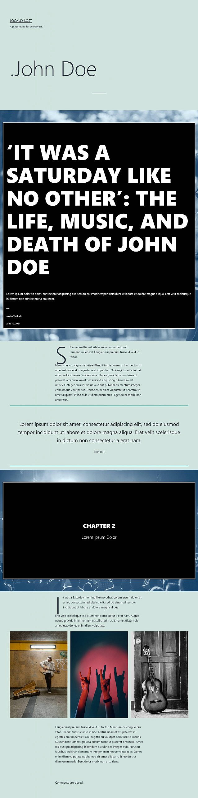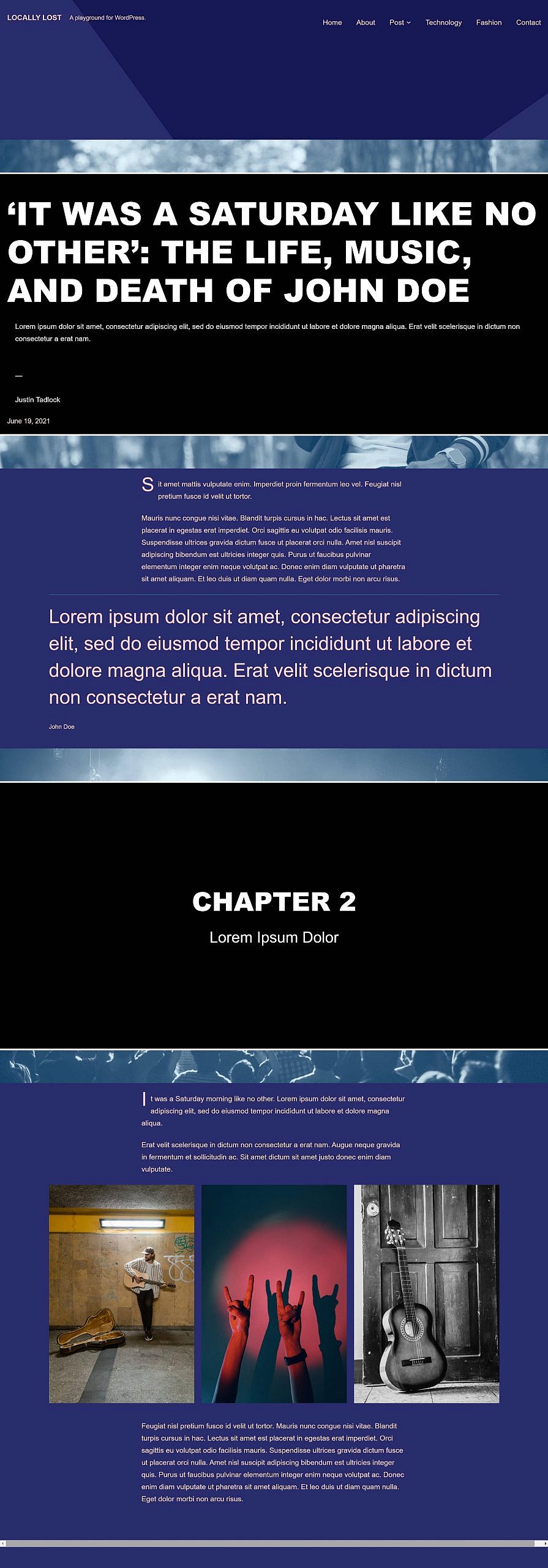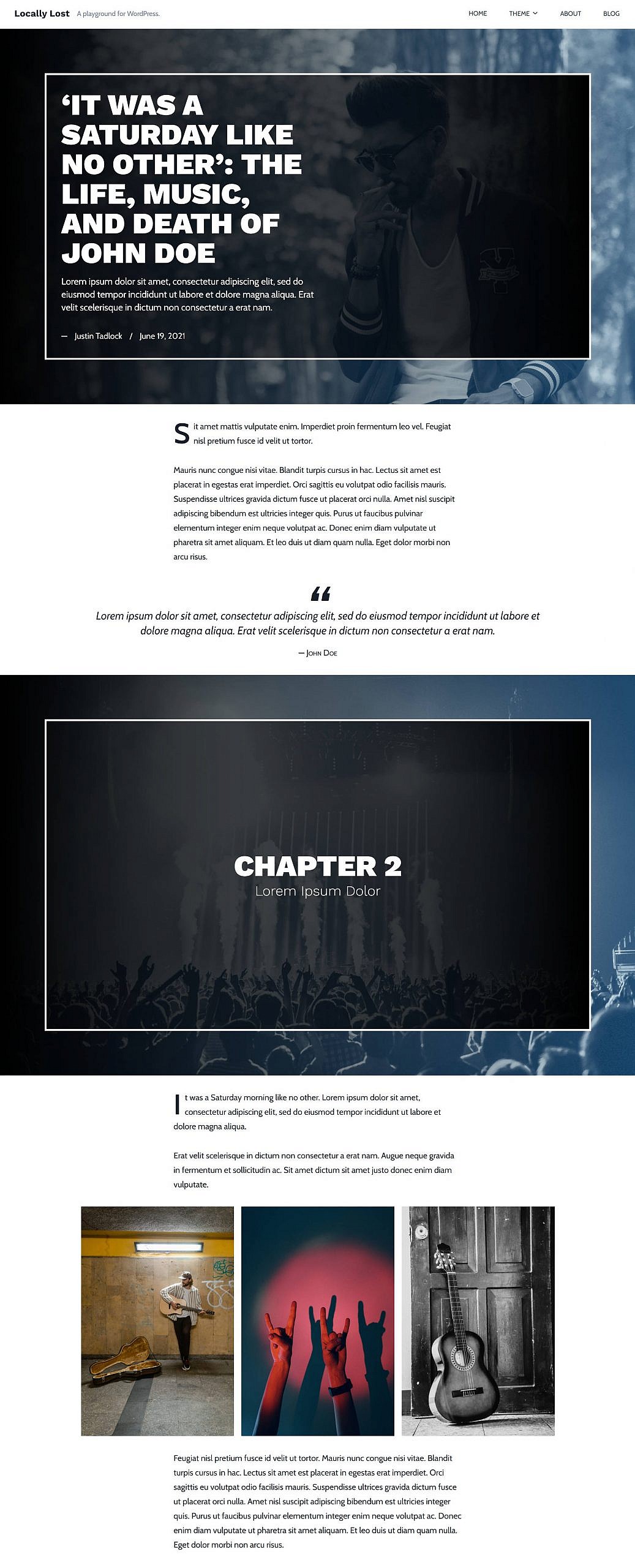 O conteúdo foi construído com meu tema personalizado e um modelo de “tela aberta”. Quadrat tinha um modelo semelhante para ocultar o título do post, mas o TT1 Blocks não.