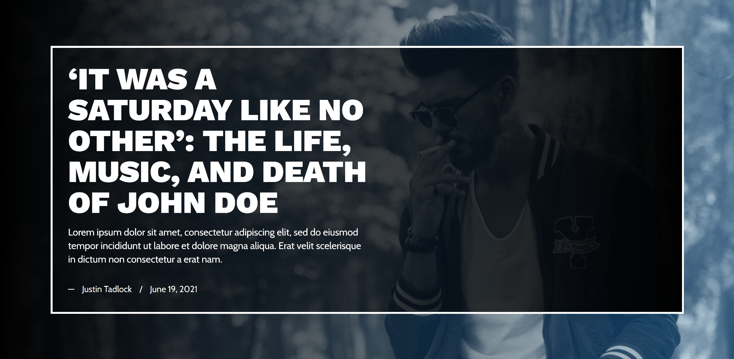 Tecnicamente, este é um bloco Cover dentro de outro. A camada inferior tem uma imagem de fundo com um filtro duotônico e define o conteúdo interno para 90% da largura de seu pai. A segunda camada tem um plano de fundo gradiente definido pelo tema e define seu contêiner interno à esquerda com 50% de largura. Além disso, tem uma pitada de tamanhos de fonte personalizados.