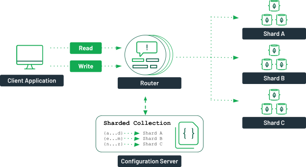 O processo de distribuição de dados em várias máquinas é conhecido como hashing. Com o MongoDB, implantações com grandes conjuntos de dados e operações de alta velocidade podem se beneficiar do uso de sharding. Um sistema de banco de dados com uma grande quantidade de dados ou um aplicativo que pode lidar com um grande número de solicitações pode ser difícil de executar em um único servidor.