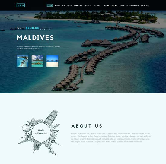 O modelo representa um estilo único, desenvolvido para fornecer uma nova solução de design para o seu site de viagens. Quais são as vantagens? Em primeiro lugar, nenhuma sobrecarga é usada. O visual minimalista aumenta a chance de transformar esses usuários em clientes reais. As belas imagens de alta resolução criarão uma atmosfera adequada, para que ninguém tenha dúvidas de que estão no lugar certo para planejar uma linda viagem. site de viagens.