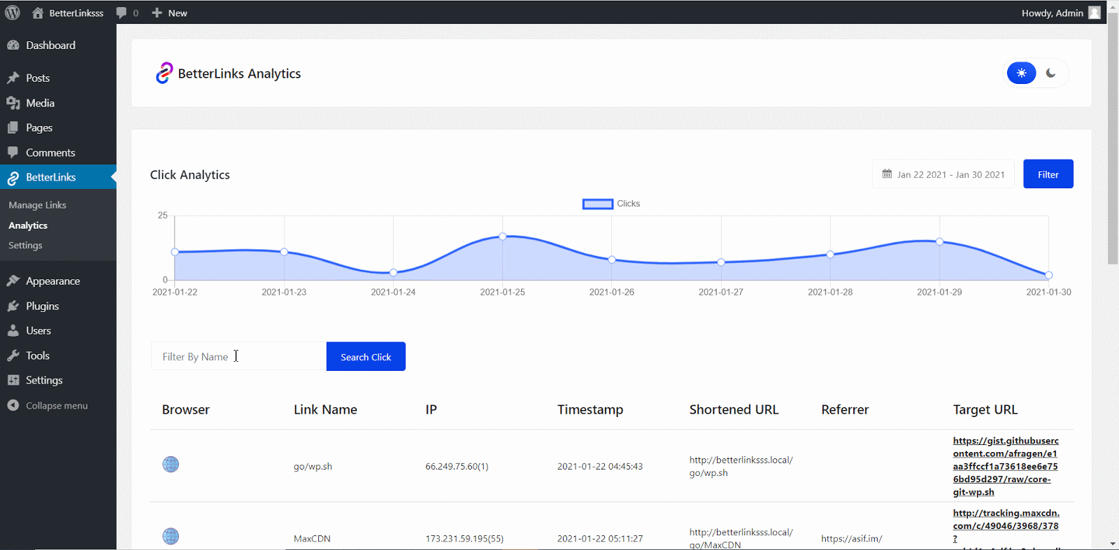 Suponha que você já tenha encurtado os URLs do seu site WordPress. Não seria fascinante ver se esses URLs estão funcionando ou não? BetterLinks permite que você acompanhe o desempenho de cada um dos seus links separadamente. O desempenho pode ser visualizado em um estilo de estatística simples.