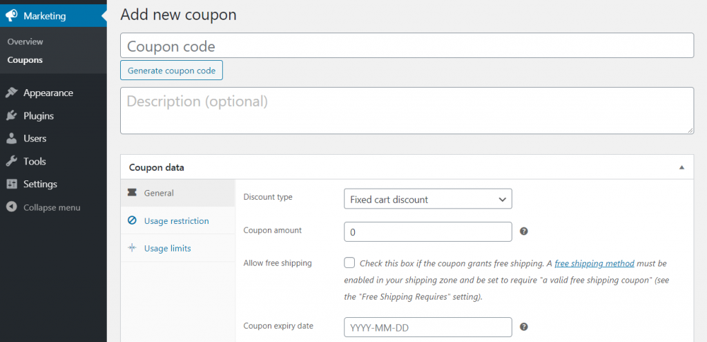 Em primeiro lugar, você vai querer configurar seu cupom. Para fazer isso, vá para Marketing > Cupons no painel do WordPress e adicione um novo cupom: