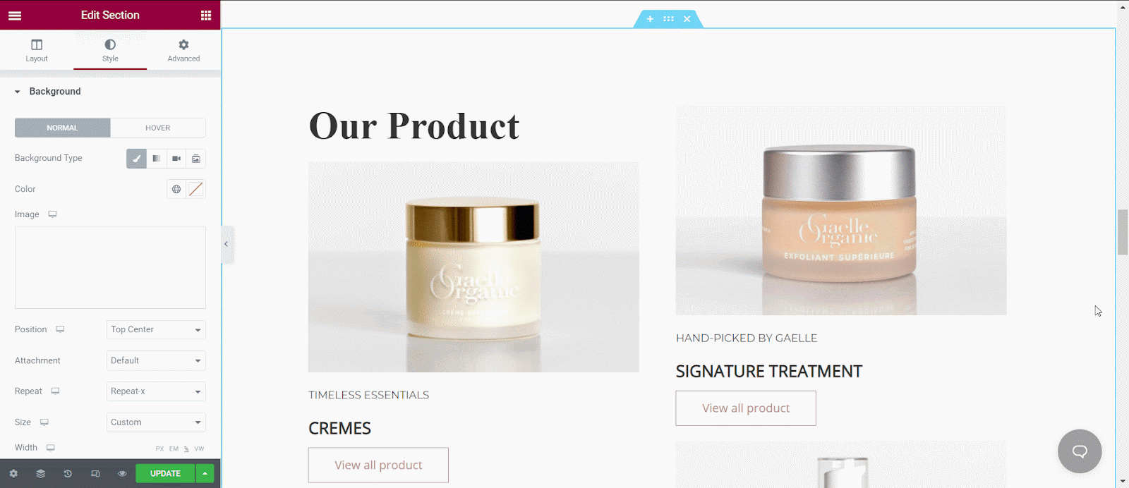 Agora é hora de personalizar seu modelo de site de cuidados com a pele para designs de página Elementor. Você deve projetar seu site com base na cor do logotipo da sua empresa de cuidados com a pele para atrair clientes em potencial. Clique em qualquer uma das partes para entrar no painel de widgets dessa seção na barra lateral esquerda, onde você pode modificar o estilo e o design do conteúdo.