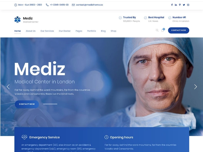 Mediz este una dintre cele mai profesioniste teme medicale WordPress care vine cu trei demonstrații pre-construite, potrivite pentru spitale, clinici și cabinete stomatologice. Pe lângă asta, poți să te joci și cu machete de 12 pagini pentru elemente precum portofoliile de doctor, liste de servicii, pagini de contact etc. Fiecare pagină are un design curat, modern, cu o preferință puternică pentru tonurile albastre.