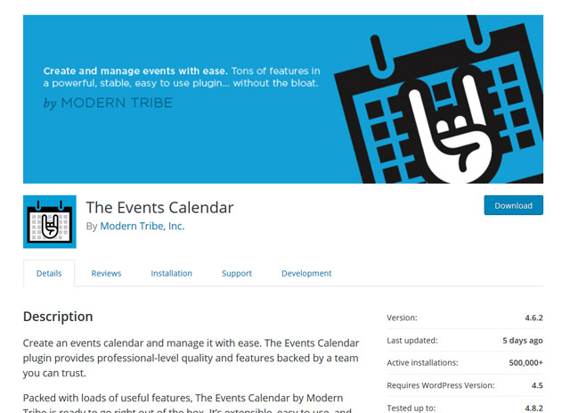 Evenimente Calendar Plugin de la Modern Tribe, este un plugin gratuit, perfect pentru a crea și gestiona evenimente într-un mod foarte simplu. Cu peste 500.000 de instalări active și peste 900 de recenzii, acest plugin s-a impus deja drept unul dintre cele mai populare și bine cotate pluginuri pentru calendar.