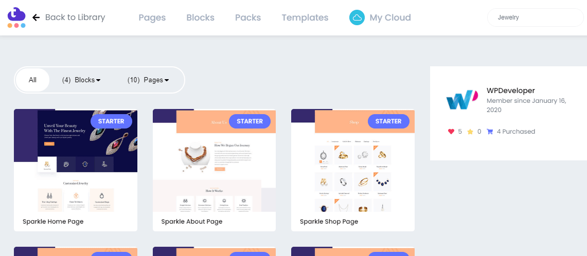 După aceea, trebuie să faceți clic pe pictograma din mijloc a paginii care vine cu Templately . Acesta va oferi o fereastră pop-up care va prezenta frumos toate șabloanele gata de Templately . Trebuie să căutați „Sparkle” sau „Bijuterii” în panoul de căutare. Apoi va afișa automat toate paginile și blocurile gata legate de el.