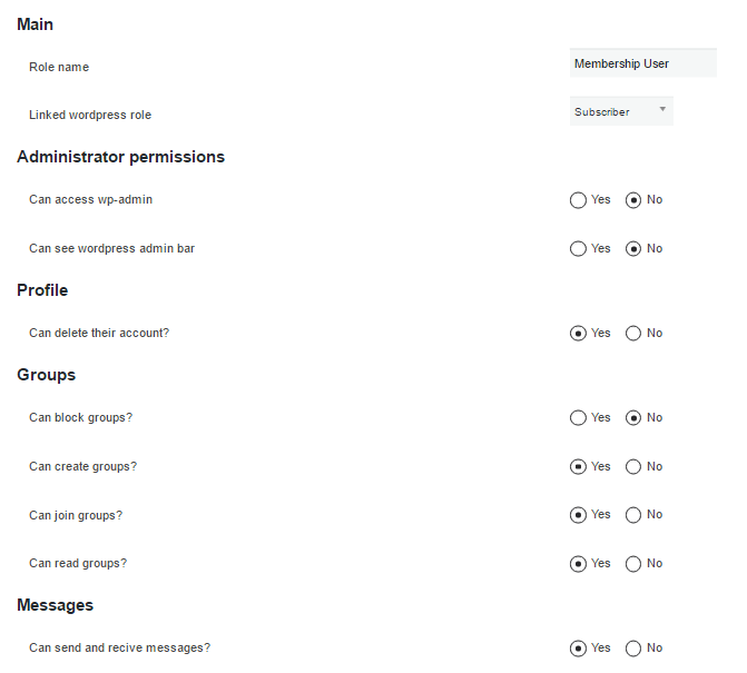 De fapt, accesul la zona de administrare WordPress, profilurile și activitățile altor utilizatori pot fi stabilite și ele. Pentru fiecare rol puteți determina accesul la anumite pagini și acțiuni. De exemplu, puteți oferi posibilitatea de a crea grupuri și puteți interzice să vedeți întreaga activitate a sistemului pentru roluri separate.