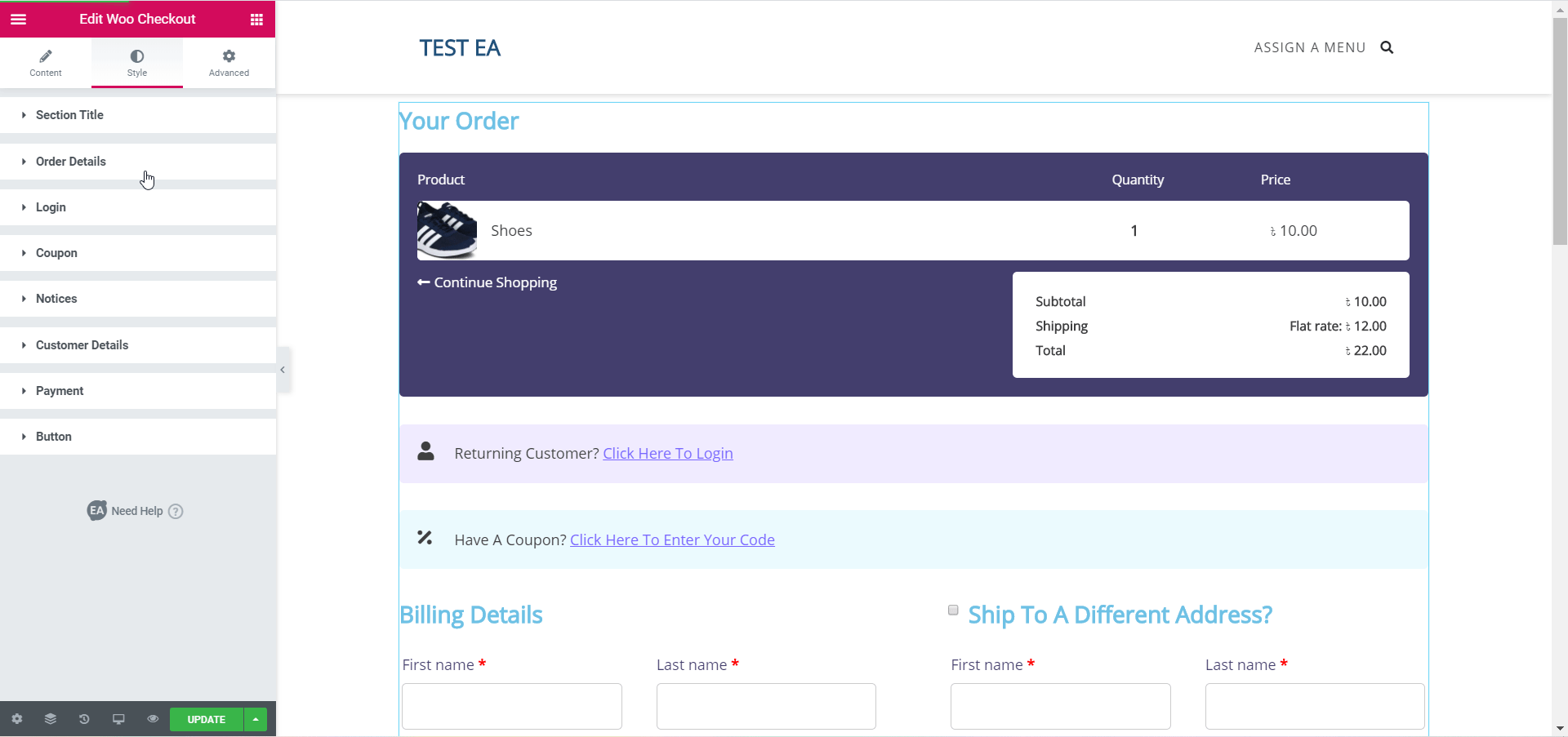 Există o mulțime de opțiuni disponibile pentru a vă stila pagina Woo Checkout în orice mod doriți. Doar faceți clic pe fila „Stil” pentru a personaliza diferite zone ale paginii dvs. Veți vedea multe opțiuni diferite, cum ar fi „Titlul secțiunii”, „Detalii comandă”, „Autentificare”, „Cupon” și multe altele.