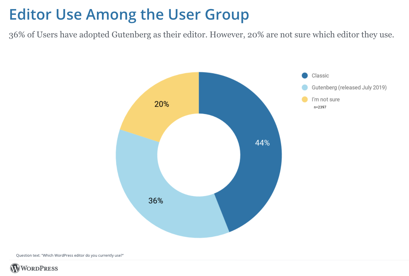 Adoptarea editorului de blocuri în rândul utilizatorilor poate fi de până la 36% sau de până la 56%, dar o mare parte a utilizatorilor (20%) nu sunt siguri ce editor folosesc. Acesta nu este un lucru rău, deoarece majoritatea utilizatorilor noi nu vor avea cunoștințe anterioare despre editorul clasic. Rezultatele sondajului din 2020 ar trebui să fie utile pentru urmărirea adoptării editorului de blocuri pe o perioadă mai lungă de timp de la debutul său în WordPress 5.0 (2018).