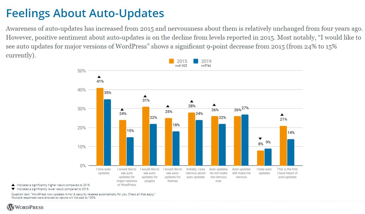 Cei care au raportat că le plac actualizările automate au scăzut de la 41% la 35%. Procentul celor care ar dori să vadă actualizări automate pentru versiunile majore ale WordPress a scăzut de la 24% la 15%. Sentimentul pozitiv cu privire la actualizările automate ale temelor și pluginurilor a scăzut, de asemenea. Între timp, gradul de conștientizare a actualizărilor automate a crescut în 2019 și puțin mai mulți utilizatori au raportat că această caracteristică îi face nervoși sau că o urăsc.
