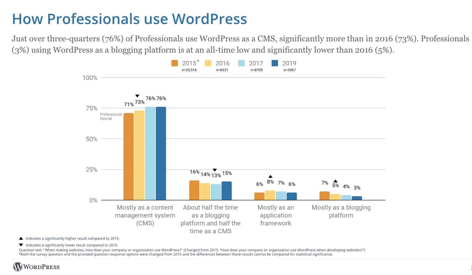 Sondajul din 2019 a constatat că 76% dintre profesioniști folosesc WordPress ca CMS, cu cifre puțin mai mari (79%) pentru segmentul WordPress Company Pros (cei care lucrează pentru o companie care proiectează/dezvoltă site-uri web). Utilizarea blogurilor în rândul profesioniștilor este în scădere constantă.