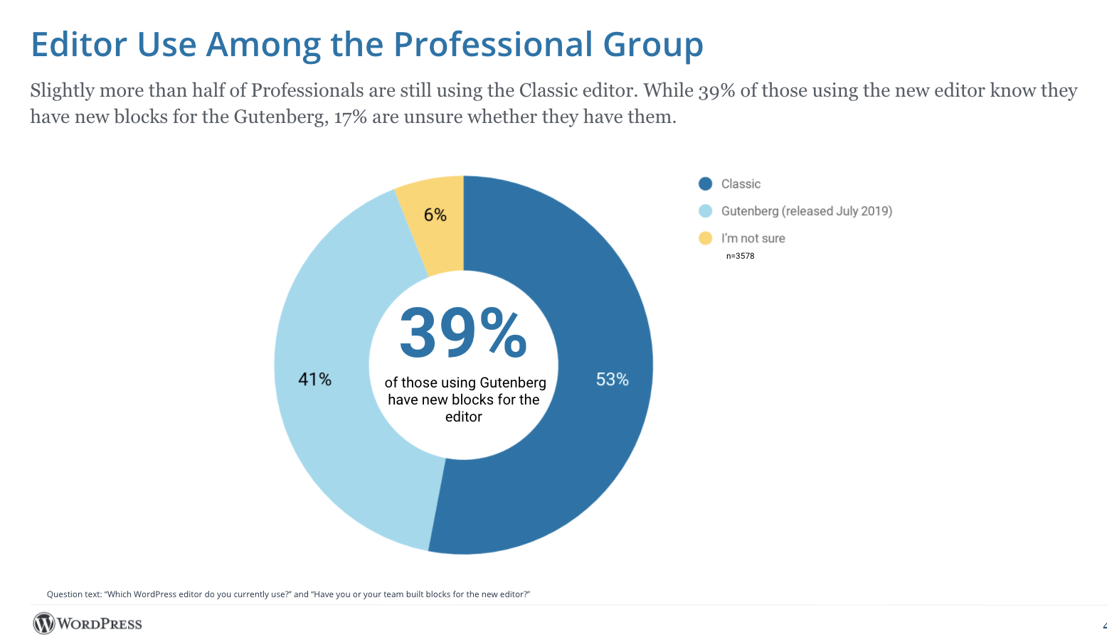 O secțiune demnă de remarcat din rezultatele din 2019 include date despre adoptarea editorului de blocuri. La întrebarea „Ce editor folosești în prezent?”, 53% dintre respondenții care s-au identificat ca profesioniști au spus că folosesc Editorul clasic. Acest lucru indică faptul că editorul de blocuri încă își găsește locul printre profesioniști. Un procent din ce în ce mai mare dintre acești profesioniști sunt și lucrători pe cont propriu (44% în 2019 față de 36% în 2016).