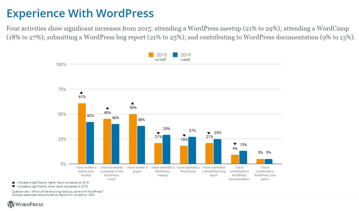 Prezența la evenimentele comunității WordPress, cum ar fi întâlnirile și WordCamps, părea să fie în creștere, precum și trimiterea de rapoarte de eroare și contribuția la documentare. Cu toate acestea, 2019 a înregistrat o scădere bruscă a procentului celor care raportează că și-au creat propria temă (61% până la 42%) sau plugin (50% până la 38%), în comparație cu anii precedenți. Procentul contribuabililor de bază (5%) a rămas constant. Acest lucru ar putea însemna că crearea de teme și pluginuri devine din ce în ce mai dificilă sau mai puțin plină de satisfacții, sau poate că sondajul a atras mai mult un alt tip de utilizator decât a făcut-o în anii precedenți. Există o mulțime de explicații, dar aceasta poate fi o tendință de urmărit în continuare.