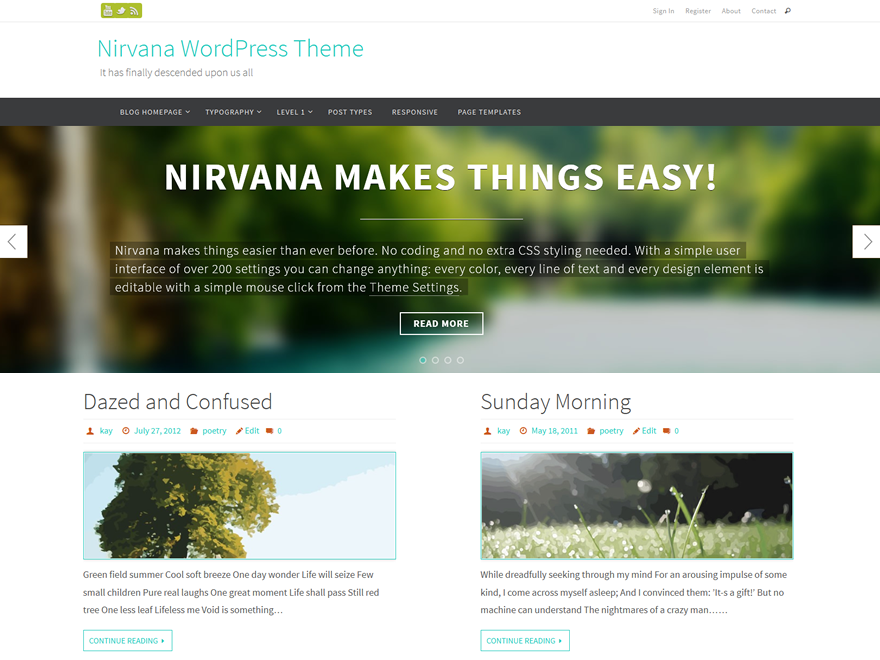 Nirvana, o temă minunată de blog de călătorie WordPress, vă permite să explorați cerurile și să vă spuneți aventurile în întreaga lume. Această temă WordPress gratuită include peste 200 de setări pentru o experiență WordPress complet personalizabilă. Folosiți o multitudine de opțiuni de font, aspect, culoare și pagină, printre altele. De asemenea, puteți selecta scheme de culori predefinite pentru a vă construi rapid și ușor site-ul web. Puteți utiliza cu ușurință un glisor de imagine excelent, o galerie de portofoliu atrăgătoare și elemente de îndemn bine concepute pentru a obține o atracție adecvată a privitorului.