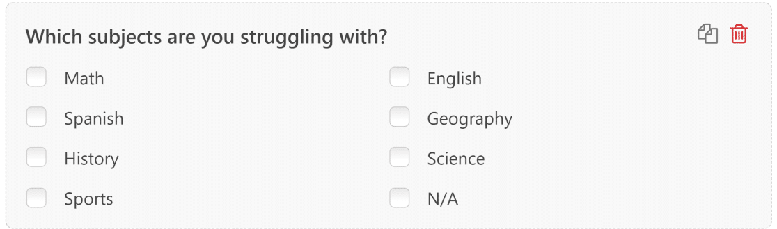 Встроенный шаблон опроса класса WPForms включает этот вопрос. Это закрытый вопрос, в котором все предметы перечислены в качестве возможных вариантов для выбора вашими учениками. Вы можете ознакомиться с нашим руководством по созданию вашей первой формы, чтобы получить инструкции по созданию формы и ее настройке.