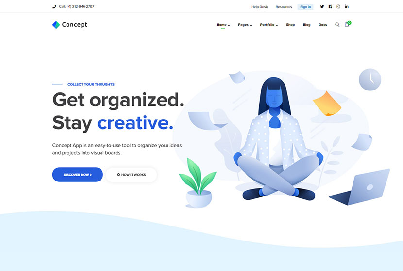 Concept Seven — еще одна многоцелевая тема WordPress, доступная с 9 макетами домашней страницы, предназначенными для приложения, консалтинга, финансов, стартапа, цифрового агентства, творческой студии, SaaS и других концепций. Его функции включают в себя гибкий встроенный конструктор страниц с перетаскиванием WPBakery, мощную интерфейсную панель администратора, совместимость с WooCommerce, встроенный слайдер Revolution, настраиваемые виджеты, множество опций, опцию липкого заголовка, неограниченные цвета и шрифты, неограниченные стили заголовков и многое другое. более.