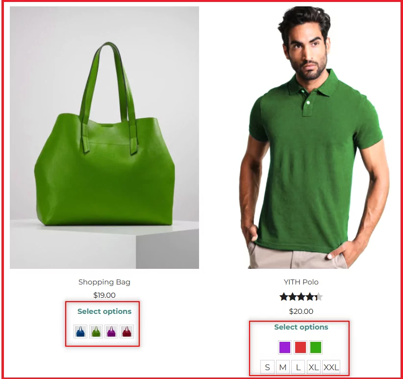 Вам также предлагается множество настроек для отображения вариантов. Вы можете отображать значки разных цветов, разные изображения для разных вариантов вашего продукта или даже текст, чтобы пользователи могли выбрать определенный размер продукта.
