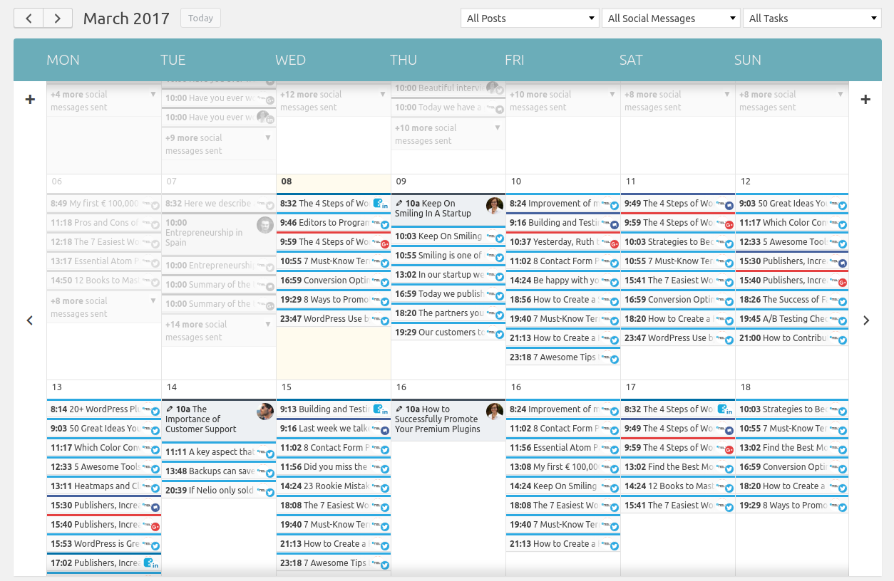 Nelio Content — это плагин с 6000 активных установок, который включает в себя редакционный календарь, редакционные комментарии, задачи и помощника по работе с контентом. Это также помогает пользователям планировать и автоматически продвигать контент в социальных сетях. Плагин объединяет соответствующие показатели из Google Analytics и учетных записей социальных сетей, чтобы помочь пользователям продвигать контент.