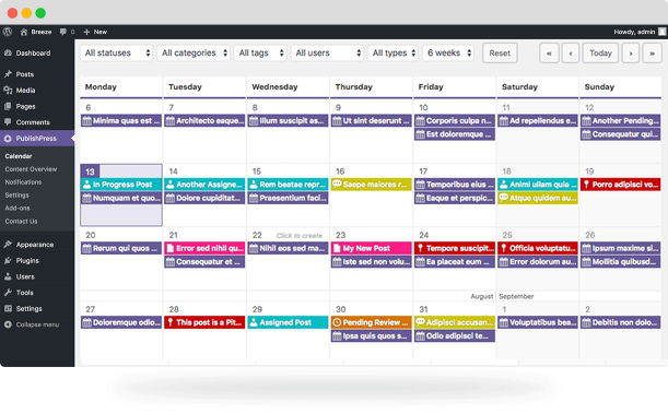 В бесплатном плагине PublishPress предоставляет редакционный календарь, уведомления, редакционные комментарии, настраиваемые статусы, обзор контента и возможность создавать настраиваемые метаданные для сообщений. Его создатели также предлагают коммерческие надстройки для таких вещей, как контрольный список контента, уведомления Slack, несколько авторов, контрольный список WooCommerce и многое другое.