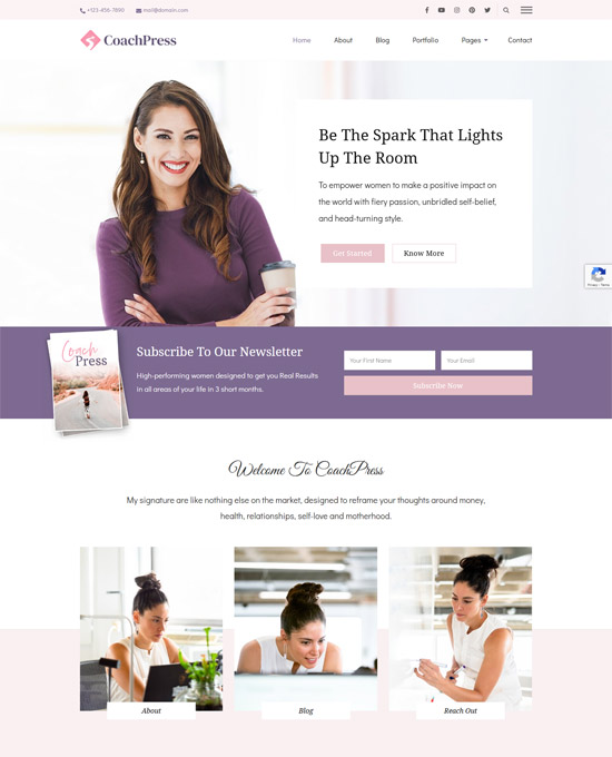 CoachPress Lite — тема WordPress для привлечения потенциальных клиентов для коучей, наставников, терапевтов, спикеров, лидеров и предпринимателей. Тема включает в себя такие разделы, как Баннер с призывом к действию, Информационный бюллетень, О нас, Услуги, Отзывы и Instagram, чтобы продемонстрировать свои услуги и помочь в создании вашего бизнеса. Эта оптимизированная по скорости тема проста в использовании, удобна для мобильных устройств и оптимизирована для SEO. CoachPress Lite готов к переводу, совместим со схемами и готов к RTL-скрипту.