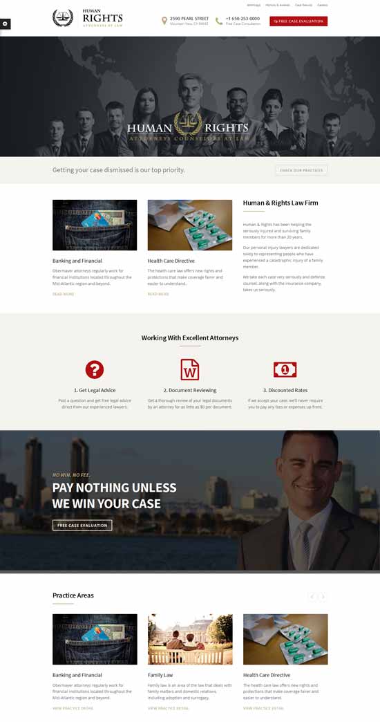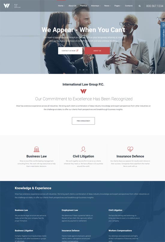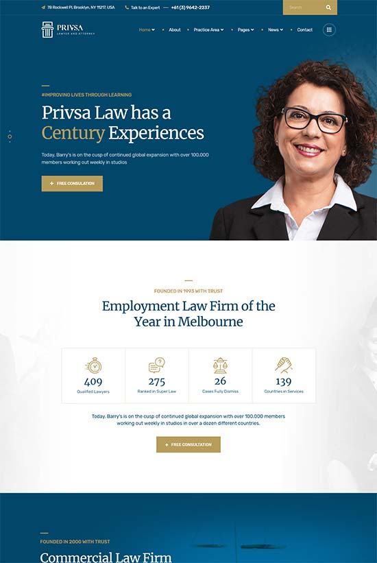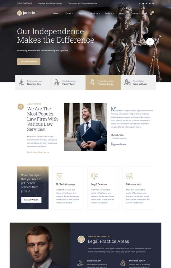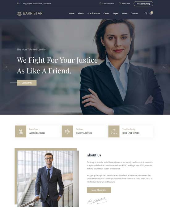 Совершенно новая тема WordPress, которая идеально подходит для юристов и всех, кто хочет продвигать свои услуги и делиться своими достижениями в Интернете. Он поставляется с множеством предопределенных шаблонов веб-страниц, которые раскрывают ключевые данные о ваших ключевых услугах, отзывы клиентов, годы практики, самые запоминающиеся случаи, список известных клиентов и многое другое. такие страницы, как «Юридическая группа», чтобы представить своих сотрудников, «Единая команда», чтобы представить информацию от конкретного сотрудника, «Области практики», чтобы поделиться своей статистикой и самой последней деятельностью, и многое другое.
