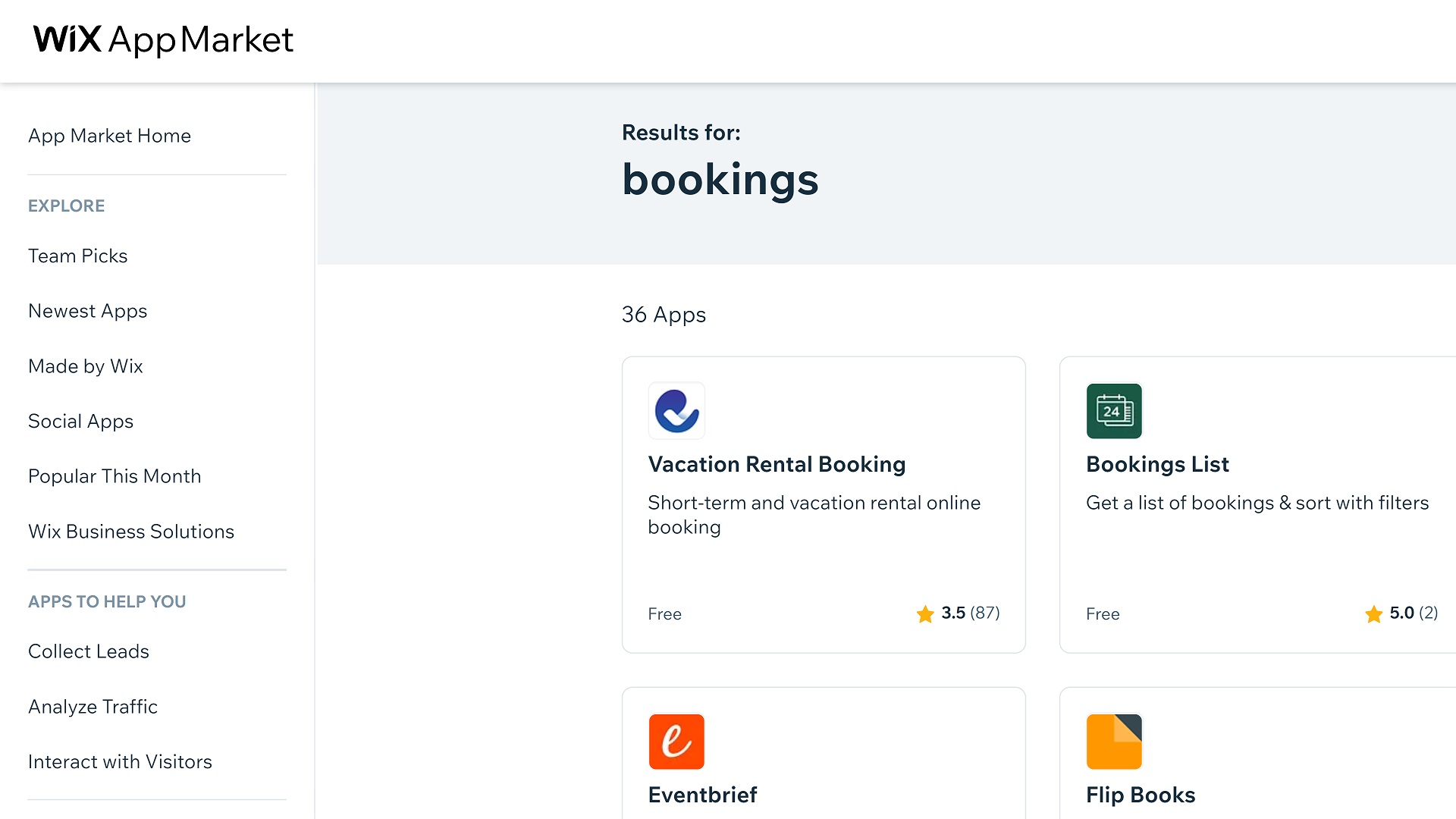 У Wix также есть сотни приложений в App Market. Они не сгруппированы так умно, как на торговой площадке Weebly, но найти подходящие варианты по-прежнему довольно легко. Например, вы можете использовать строку поиска в верхней части страницы. Мы протестировали его, и простой поиск по запросу «бронирования» выдал 36 отличных результатов, и выбрать среди них было бы сложно.