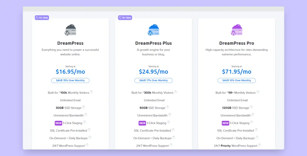 DreamHost | $2,59/в месяц | ДА | ДА | Неограниченный | 4 ГБ – 16 ГБ | 99% | ДА |