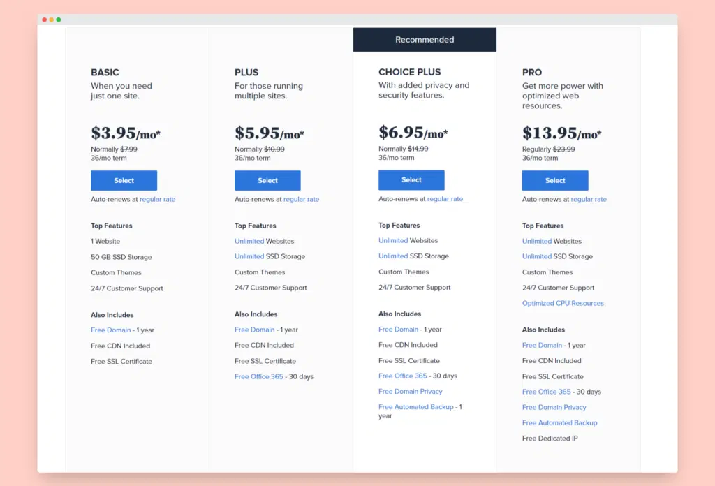 - Pro ( $ 4,95 / мес ): неограниченный веб-сайт, хранилище, пропускная способность, бесплатный домен на один год, 2-кратное увеличение производительности.