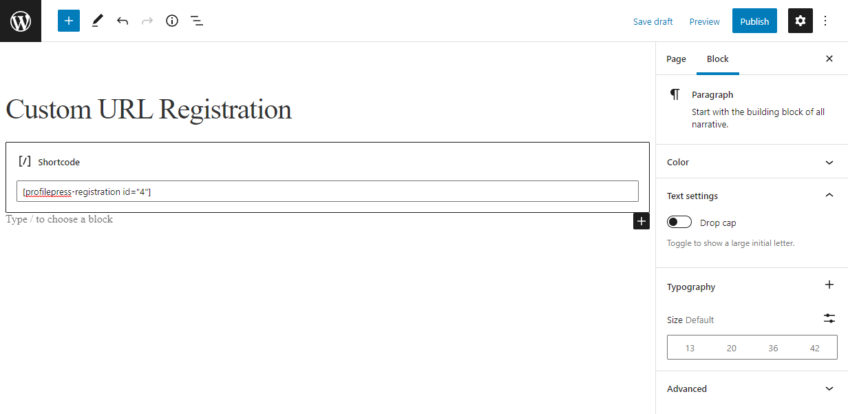 ด้วยทั้งหน้าเข้าสู่ระบบและการลงทะเบียนแบบกำหนดเองที่สร้างและพร้อมใช้งานแล้ว ให้วางรหัสย่อของแบบฟอร์มลงในหน้า WordPress ใหม่