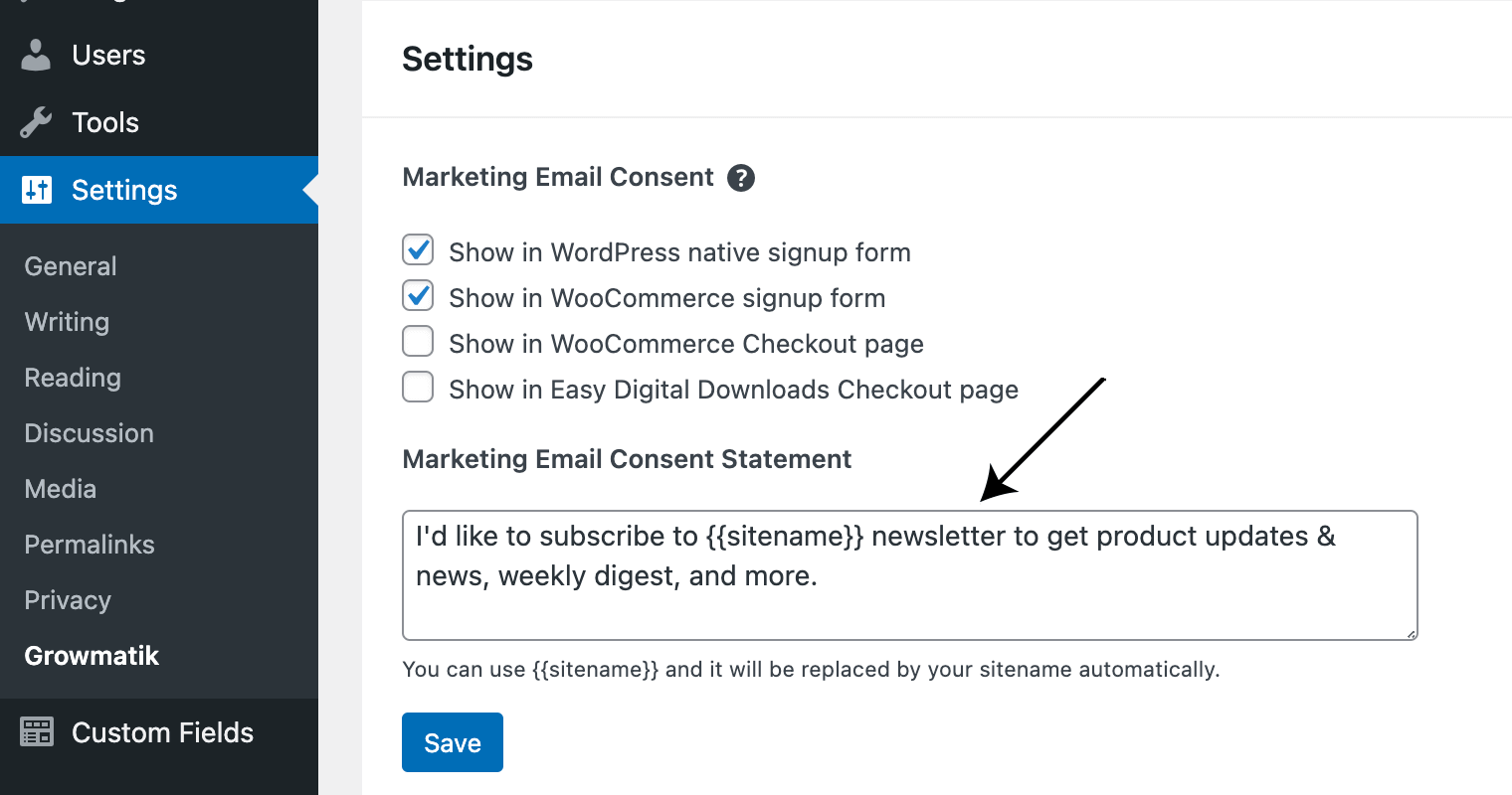 Growmatik ปรับปรุงกระบวนการขอความยินยอมในไม่กี่ขั้นตอนง่ายๆ คุณต้องแสดงและจัดการข้อตกลงเงื่อนไขและข้อกำหนดของคุณเมื่อรวบรวมข้อมูล และเพื่อให้บรรลุเป้าหมายนี้ คุณควรเพิ่มคำชี้แจงความยินยอมทางอีเมลทางการตลาดลงในแบบฟอร์มการสมัครใช้งานของคุณ ซึ่งผู้ใช้จำเป็นต้องทำเครื่องหมายหากพวกเขาต้องการรับเอกสารทางการตลาดเพิ่มเติมจากคุณ หากต้องการรวมคำชี้แจงความยินยอมของอีเมลทางการตลาด ให้ไปที่แดชบอร์ด WordPress แล้วเลือกการตั้งค่า จากนั้นเลือก Growmatik จากแถบด้านข้างทางซ้าย คุณสามารถกำหนดคำแถลงและเลือกตำแหน่งที่จะแสดงได้ที่นี่: