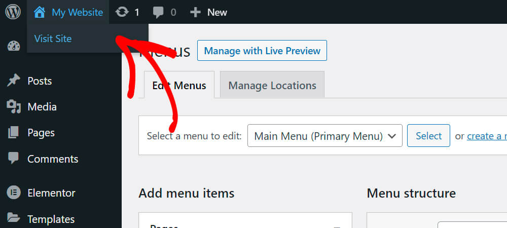 วิธีที่เร็วที่สุดในการทำเช่นนั้นคือการกดปุ่ม เยี่ยมชมไซต์ ใต้ชื่อไซต์ของคุณที่ด้านบนซ้าย