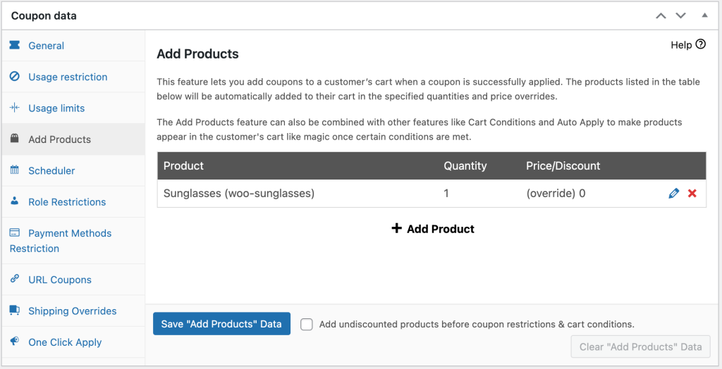 - เพิ่มสินค้า – คุณลักษณะนี้ช่วยให้คุณสามารถเพิ่มสินค้าลงในตะกร้าสินค้าของลูกค้าได้เมื่อมีการใช้คูปอง คุณยังสามารถเลือกที่จะแทนที่ราคาซึ่งสำคัญมากได้ที่นี่