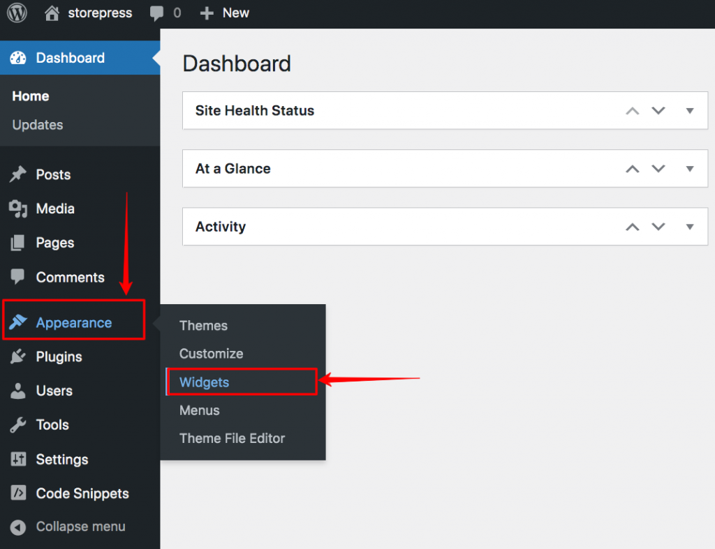 ขั้นตอนที่ 1: ไปที่ Dashboard เลื่อนเคอร์เซอร์ไปที่ Appearance จากนั้นคลิกที่ Widgets หากคุณต้องการ คุณสามารถเรียนรู้วิธีเพิ่มวิดเจ็ตใน WordPress