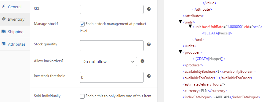 สต็อคของผลิตภัณฑ์อยู่ในฟิลด์ <availabilityCount> คลิก เปิดใช้งานการจัดการสต็อคที่ระดับผลิตภัณฑ์ และแมปฟิลด์ <availabilityCount> :