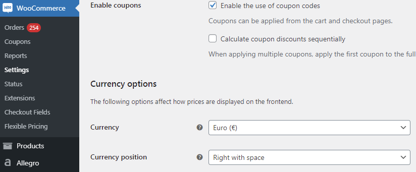 ฉันคิดว่าคุณมีการติดตั้ง WooCommerce ที่ใช้งานอยู่แล้ว ไปที่การตั้งค่าหลักของร้านค้า และตรวจสอบให้แน่ใจว่าพารามิเตอร์ของร้านค้าตรงกับพารามิเตอร์ของไฟล์ XML ของคุณ: