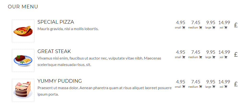 ปรับเลย์เอาต์ของเมนูและให้ปรากฏบนไซต์ของคุณโดยใช้เทมเพลตต่างๆ รวมรูปภาพและข้อมูลราคาพร้อมกับทุกรายการเมนู คุณยังสามารถซื้อโปรเสริม (มีราคา 25 ดอลลาร์) ที่เพิ่มการสนับสนุนสำหรับไอคอนอาหารต่างๆ เช่น รายการพิเศษ ส่วนลด และปราศจากกลูเตน ปัจจุบัน ส่วนเสริมนี้ไม่มีข้อมูลโภชนาการหรือส่วนผสม แต่มีคุณลักษณะบางอย่างที่ปลั๊กอินอื่น ๆ มักไม่มี