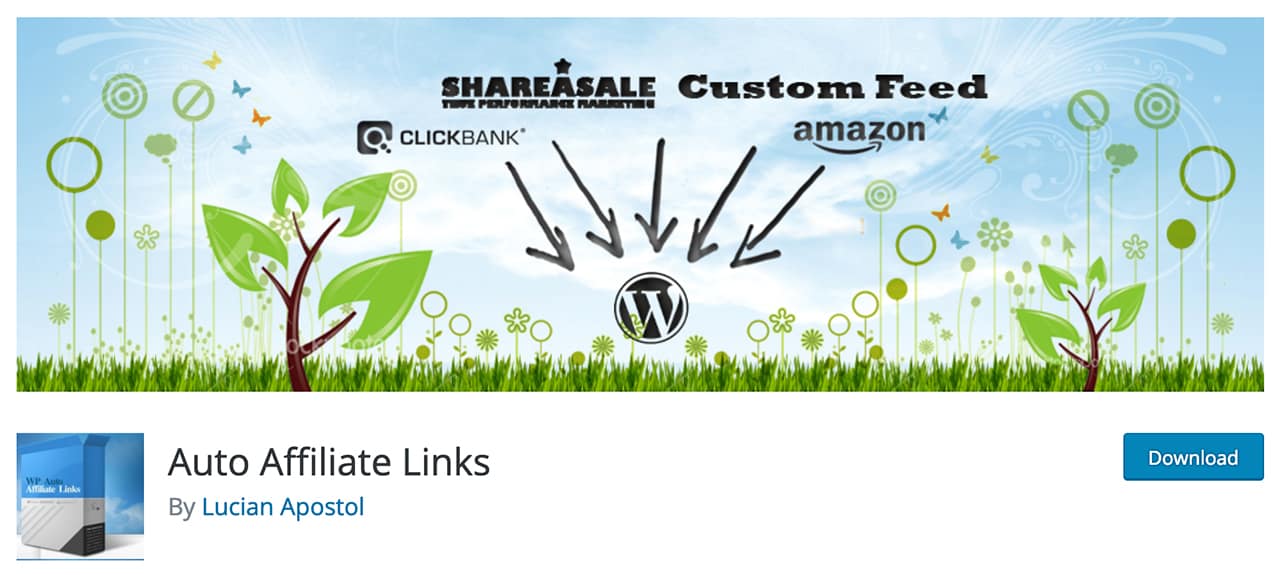 Otomatik Satış Ortaklığı Bağlantıları, blog yazılarınıza ve sayfalarınıza otomatik olarak bağlı kuruluş bağlantıları ekleyen bir eklentidir. Eklenti 4 yıldızlı bir derecelendirmeye ve 4 000+ aktif yüklemeye sahiptir. Eklenti, Clickbank, Shareasale, Amazon, Ebay, Envato Marketplace ve daha fazlası gibi üçüncü taraf bağlı kuruluş programlarıyla çalışır.